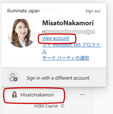 - Microsoft 365 の各画面に存在する自分の名前 (Copilot Chat 画面なら左下に表示されている名前) の上をクリックし [View account] をクリックします。