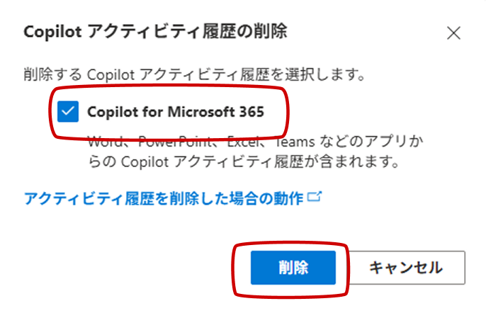 - 表示されるダイアログから [Copilot for Microsoft 365] にチェックをし、[削除] ボタンをクリックします。