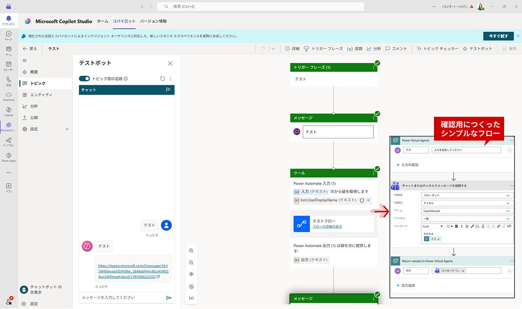 - フローを含むトピックの保存 (作成・保存・テストボットによる動作確認まで正常動作を確認)