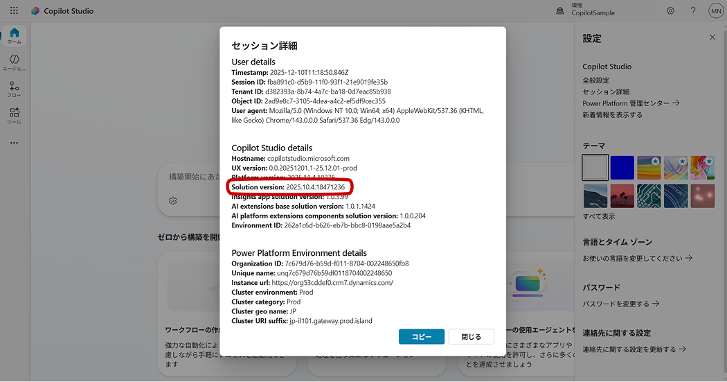 自分の環境が正常に動作できる状況になったかどうかを確認したい場合、Web 版の Copilot Studio からソリューションのバージョンを確認しましょう。