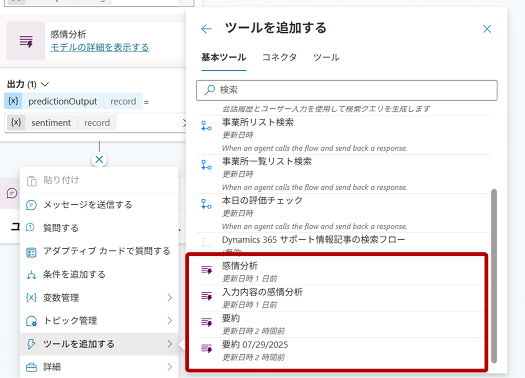 自分が作成したプロンプトは、トピックを編集している際、「ツールを追加する」メニュー内の [基本ツール] タブに表示され、選択してすぐに利用できるようになっています。共通処理の再利用や保守性の向上につながります。