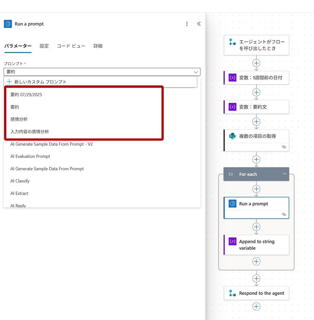 ※ 画面の内容は、ヘルプデスクの評価リストを1 週間に 1 回確認し、評価内容を要約して返すというもの。エージェント フローの場合、100 アクションの利用で Copilot Studio のメッセージ容量が 13 メッセージ分消費されるという料金体系なので、AI Builder の利用もクレジット消費をより安価に利用可能です (2025年7月現在の内容です)
