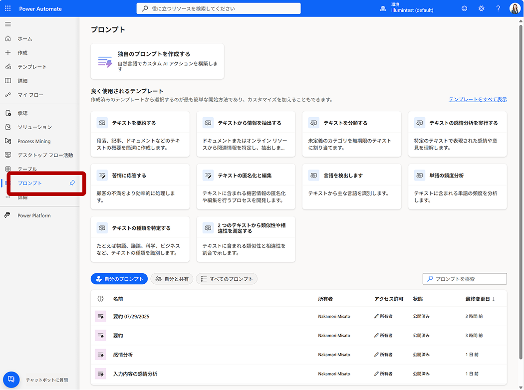 Power Automate ナビゲーションにある「プロンプト」から、作成した “プロンプト” の一覧を見ることができます。この画面では、作成済みのプロンプトを共有や削除も可能です。