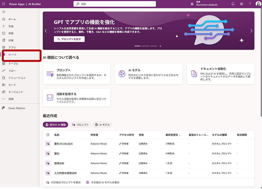 Power Apps の AI Hub には、“プロンプト” を含む AI 関連のリソースがまとめられています。