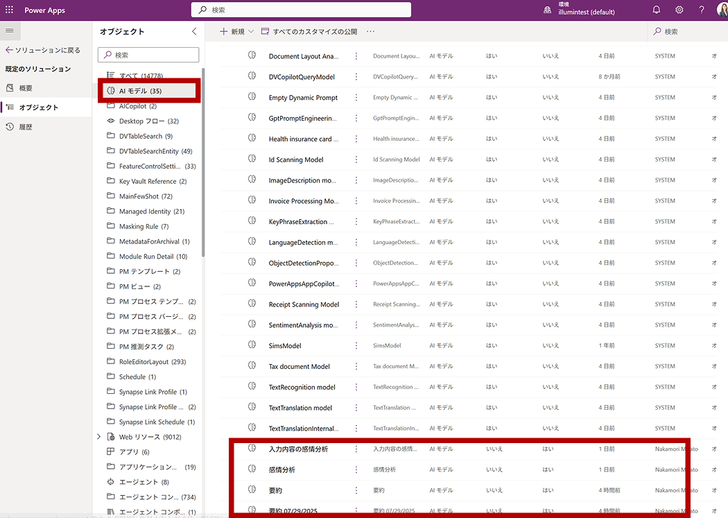 ソリューションからも確認可能です。ソリューションを指定して作成しなかった場合は環境内の既定のソリューションに保存されます。ソリューションから確認した場合、 “プロンプト” が カスタム AI モデルとして扱われており、より詳細な管理や削除の確認にも対応しています。