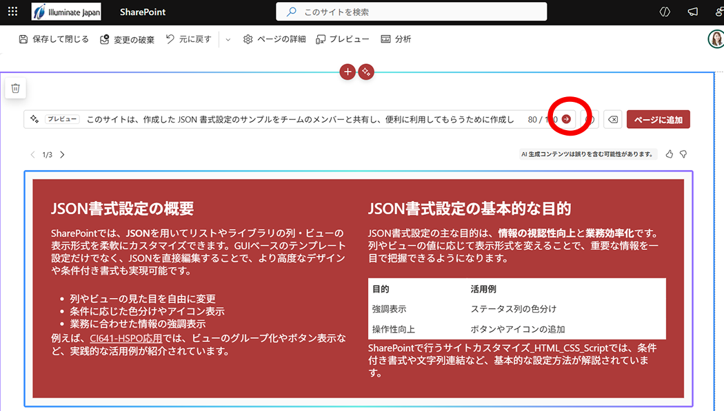 ページ作成時にプロンプトを入力すると、AI が内容案とレイアウトを自動で提案してくれるこの機能は、Microsoft 365 Copilot と連携しながら、ページ編集体験を大きく変えようとしています。