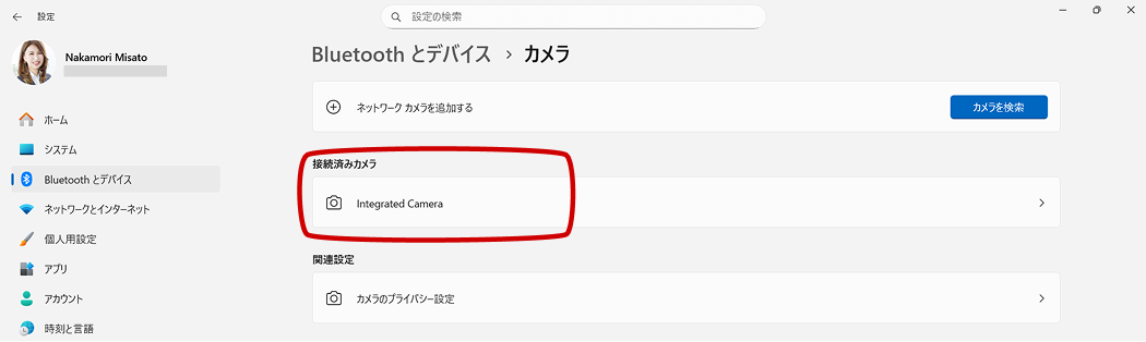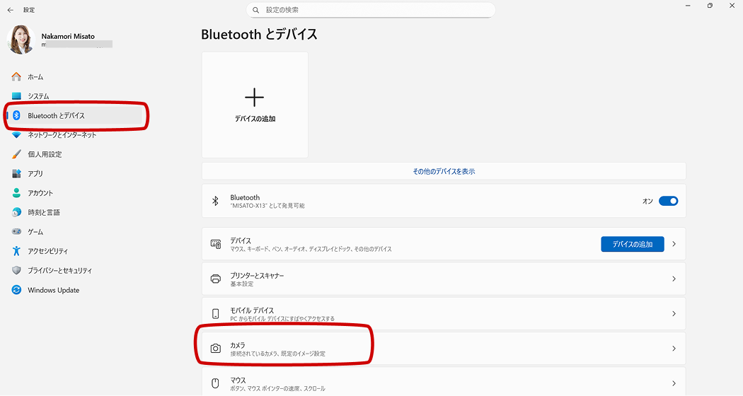 2. ナビゲーションより [Bluetooth とデバイス] をクリックし、[カメラ] をクリックします。