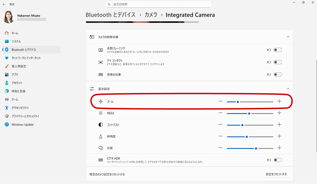 Teams の中にはズーム設定が見当たりませんが、実は Windows のカメラ設定 で調整できます。